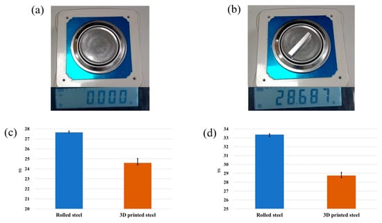 Figure 7 shows the experimental results. Figure 7a shows the weights and measures instrument in the loading state. Figure 7b shows the weights and measures instrument in the loading state. The digital precision weights and measures instrument is manufactured by Nanxing Corp. Figure 7c shows the average weight of the tensile specimens. The blue bar is rolled steel, weighing 27.65 ± 0.1 g. The orange bar is 3D additive steel and weighs 24.04 ± 0.3 g. We found that the weight of the 3D additive manufactured material is lighter by 13.1% compared to the rolled material when the workpieces were manufactured into tensile specimens. Figure 7d shows the average weight of the block specimens. Rolled steel weighs 33.36 ± 0.2 g, as shown in the blue bar. The weight of the 3D additive manufactured material is 28.75 ± 0.3 g, as shown in the orange bar. The 3D additive manufactured steel specimens are lighter, by 13.83%, compared to the general rolled steel. These results show that the qualities of the 3D additive manufacturing are nearly the same in terms of porosity when the printing process is under the same laser power and scanner speed [].