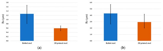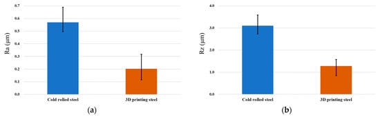 The surface roughness in Ra and Rz after the milling machine cutting of the surface of the block specimens. (a) The surface roughness in Ra. (b) The surface roughness in Rz.