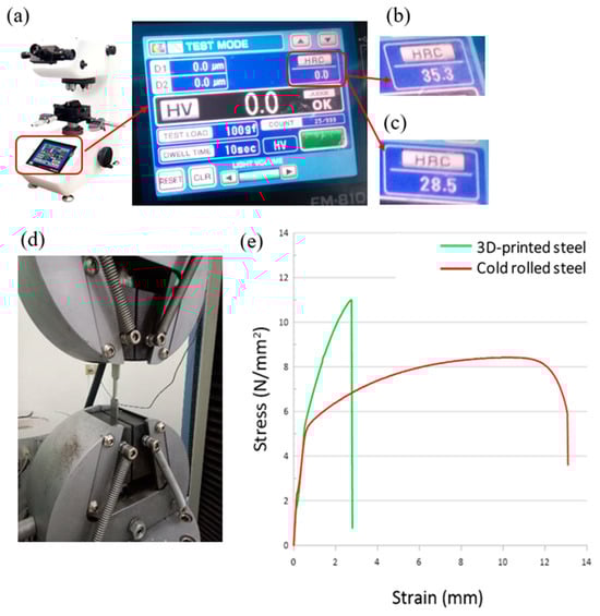 In order to explore the reason why the performance of 3D-printed steel is better than that of rolled steel in terms of surface roughness after milling or grinding of the surface of the specimens, we used the FM-810e Microhardness tester to measure the hardness in the surface of the specimens, as shown in Figure 10a. The measurement specimens were rolled steel and 3D-printed steel, as shown in Figure 4. Figure 10b shows the measurement results of the 3D-printed steel. The hardness of HRC is about 35.3 ± 3.0. Figure 10c shows the measurement results of the rolled steel. The hardness of HRC is about 28.3 + 3.0/−1.5. In addition, we also used a metal tensile tester to test the performance of 3D-printed steel and rolled steel made of 316L SS. The metal tensile tester was manufactured by Chun Yen Corp., as shown in Figure 10d. Figure 10e shows the experimental results of 3D-printed and rolled steel in terms of the tensile strength and strain. We found that 3D printed steel is better than rolled steel in terms of the hardness and tensile strength index. However, the elongation materials are only below 25% compared to the rolled steel from the experimental results. This phenomenon is nearly the same as that of Basavraj, B. et al. []. It shows that the 3D-printed steel is a hard and brittle material, so post-processing can be used to optimize the surface roughness and fineness of the parts.
