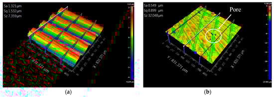 Figure 11 and Figure 12 show the surface morphology when the specimens of 3D additive manufactured and rolled steel were milled and ground on the surface. We observed that the index of 3D additive steel is higher than that of rolled steel in Sz. It is due to the pore phenomenon during 3D additive printing []. The pore will increase the Sz index and reduce the specimen’s weight. It may cause fatigue and cracks in the parts when the parts are used in the dynamic [].