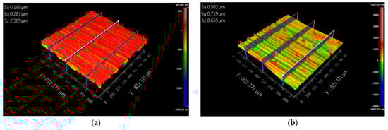 In addition, the measurement of the surface roughness in the metal has been widely presented with 3D geometric shapes in recent years []. Therefore, the workpiece’s surface morphology can be given as Sa, Sq, and Sz. Sa represents the absolute mean value relative to the height difference at each point of the measurement surface. The formula is given as (6).