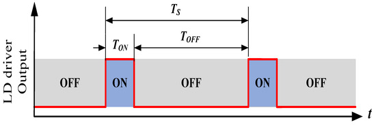 A QCW LD driver is the pump source used to drive a QCW LD, bar, and stack, and it is switched on only for time intervals short enough to reduce thermal effects significantly but long enough to bring the laser process close to its steady state, as shown in Figure 1. In other words, the laser is optically in the state of CW operation. The duty cycle may be only a few percent, thus greatly reducing heating and all related thermal effects, such as thermal lensing and damage through overheating [8,9,10]. To maintain consistent power of each laser pulse, the driver typically requires a constant-current output [11,12,13,14]. Such drivers are designed to deliver peak current pulses to LDs while maintaining low average power levels. The duty cycle D of such a pulse current is calculated in Equation (1):