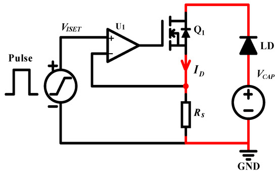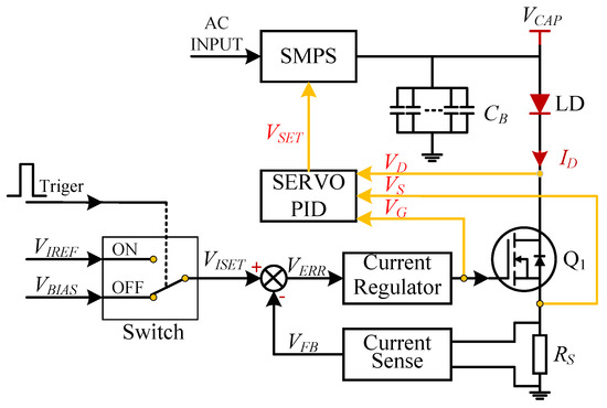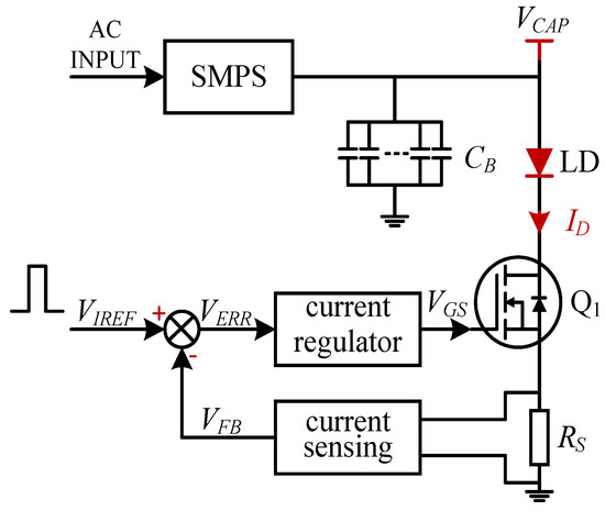 Figure 2 shows a schematic of a typical simplified QCW LD driver. The AC voltage is passed through the SMPS to generate a constant DC voltage suitable for the system’s operation. In general, this voltage is required so that the MOSFET operates in the saturation region to attain a sufficient voltage margin against possible fluctuations. To provide sufficient power at discharge, a capacitor bank needs to be placed at the SMPS output. The current flowing through the LD is controlled using a closed-loop feedback circuit with the input voltage as a reference. Specifically, the output current flowing through the LD is sampled by the sampling resistance and passed through the current-sensing module to become the feedback voltage , which is compared with the reference voltage to obtain the error signal . After passing through the current regulator, the gate-to-source voltage of the MOSFET is generated to control the current , which is represented by Equation (2), where is the gain of the feedback circuit: