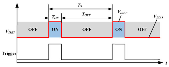 where is the current pulse ON state duration and is the cycle duration. In Figure 1, is the current pulse OFF state duration, and t is the timeline.