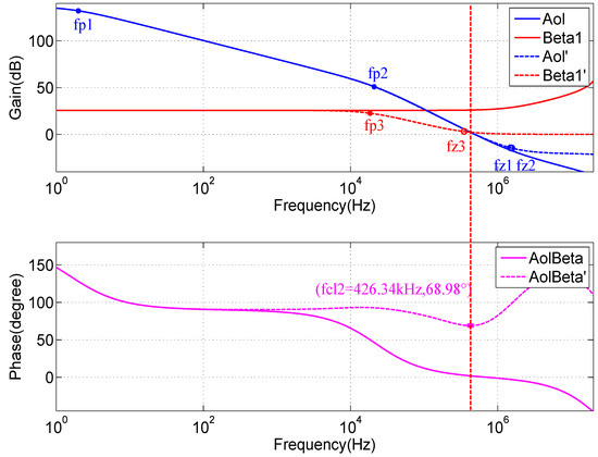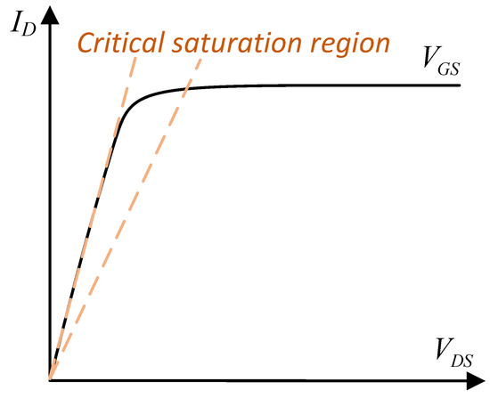 According to the characteristics of a MOSFET, the transconductance reaches its maximum value at the critical saturation operating point, where . If we need to reduce MOSFET losses further or focus on reliability, can be multiplied by a factor, as shown in Equation (18). When , the MOSFET losses are smaller; when , the resistance-to-power perturbations improve. Of note, a is close to unity for the sake of both efficiency and stability. In this study, :