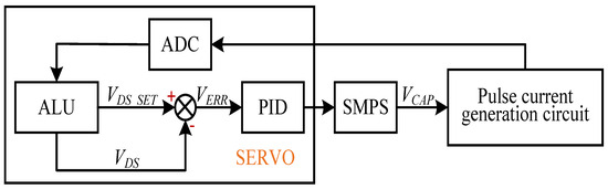 We lock indirectly at the critical saturation operating point by controlling . Figure 7 shows a simplified control block diagram. After the LD driver engages, the servo controller samples , , and at the ON state of each cycle by ADCs (analog to digital converters) and calculates and using an ALU (arithmetic logic unit). The reference voltage is calculated using Equation (18), and the error is obtained using Equation (19). The PID controls the voltage of the SMPS in the subsequent OFF state, such that the error tends toward zero: