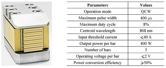 Diode-pumped solid-state lasers (DPSSLs) are widely used in industrial, scientific, and military fields [1,2,3,4]. Traditionally, high-power pulsed DPSSLs have been obtained by Q-switching technology, typically using continuous-wave (CW) laser diode (LD) arrays to pump laser gain materials, such as Nd:YAG rods or slabs. However, pumping with QCW LD arrays yields more advantages. The peak power of a QCW LD array is higher than that of a CW array. In addition, a QCW pump can reduce the heat of a laser’s gain material and improve the quality of its laser beam, which is more desirable for users [5,6,7].