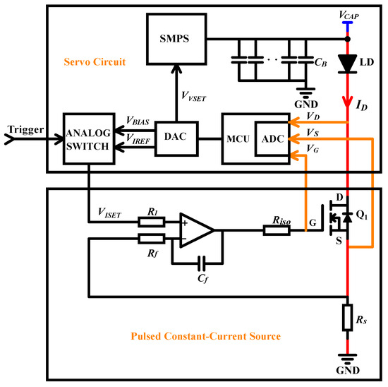 As shown in Figure 8, a high-efficiency QCW LD driver is required in our laser system to drive the laser stack. We designed the circuit based on the parameters in Table 1, and a diagram of the circuit block is shown in Figure 9. The driver comprises a servo circuit and a pulsed constant-current source. The latter improves the power supply capacity through a multistage parallel operation [21,22,23]. Because of the development of high-power MOSFETs, we meet the design requirements with a single module and a simplified circuit structure.