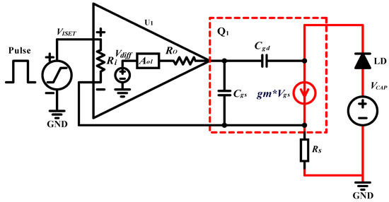 A QCW LD driver, which uses a MOSFET-based transconductance amplifier as the key constant-current circuit [27,28], is essentially a voltage-controlled constant-current source, as shown in Figure 10. Since a pulsed constant-current source is needed, the stability of the circuit is a key consideration. To further analyze the stability of the circuit, its high-frequency and small-signal equivalent model is considered, as shown in Figure 11. The input resistance of the op-amp , which is typically very large, can be considered an open circuit. The input differential voltage is approximately equal to , is the open-loop gain, and is the open-loop output impedance. According to the data sheet, is ∼134 dB, is ∼375 is ohms, and the unity gain bandwidth is ∼10 MHz. For power MOSFETs, the parasitic capacitances, such as and , are typically very high. According to the IXTH360N055T2 data sheet, nF was measured at 1 MHz, with a gate-to-source voltage of 0 V and a drain-to-source voltage of 25 V. Thus, the effects of and cannot be neglected. The open-loop gain curve of an op-amp typically has a low-frequency pole; according to the OPA2197 manual, Hz. A second pole introduced in the open-loop gain curve is due to the effect of the open-loop output resistance and the MOSFET input capacitance . Here, we neglect the effects of and since their values are much smaller than . The frequency of the second pole, , is calculated using Equation (27):