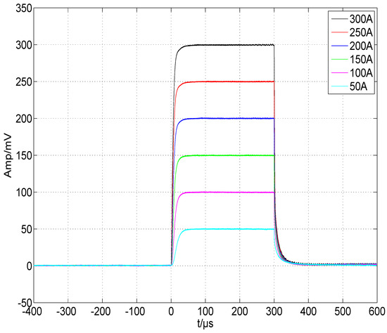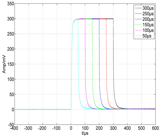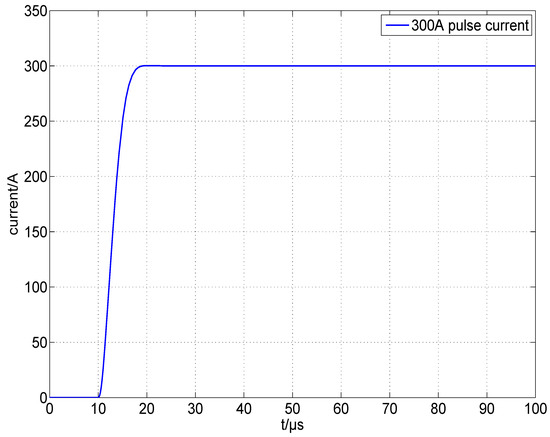 We first debugged the pulsed constant-current source circuit shown in Figure 13, setting at a fixed value and retaining a sufficient margin so that always held. The connection between the GS20 load under test and the driver was as short as possible to minimize the effect of parasitic inductance on the current pulse, and we used a low-inductance cable. Finally, we applied , , and pF for the compensation. Figure 18 shows the waveform of the current pulse sequence, with a pulse width of ∼300 s, a current of ∼300 A, and a repetition rate of 100 Hz. Channel 1 was the voltage waveform of , named , and channel 2 was the waveform of the trigger pulse, named . Figure 19 shows the waveform of a single current pulse, with a rising time of 10.2 s, a falling time of 13.0 s, an overshoot of 0.53%, and a of 299.6 mV, corresponding to a load current of 299.6 A. The current value was stepped by 50 A, and the results are plotted in Figure 20 using MATLAB, R2019. The pulse width was stepped by 50 s, and the results are plotted in Figure 21. Finally, we sampled 1,000,000 values of the current pulse using an ADC inside the driver, and the statistical results are shown in Table 5. The above test results indicate that the shape and value of the current pulse can be properly controlled by the circuit and parameters designed in this study.
