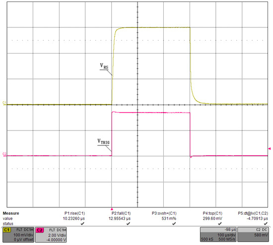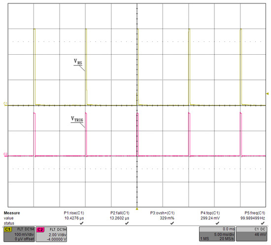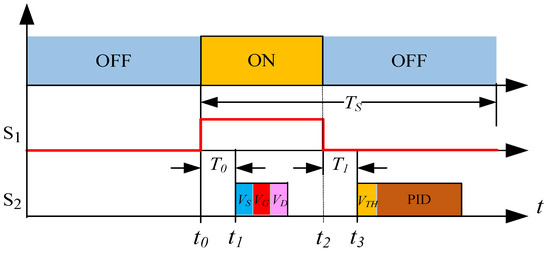 According to the description of the load-adaptive driving method in Section 1.3.2, we need to lock the drain-to-source voltage of the MOSFET to the set value (see Equation (18) and (19)). Computing the PID input error requires sampling the values of , and , which were obtained at different times. As shown in Figure 16, is the trigger pulse with period , and represents the PID control sequence. The servo controller detects the rising edge of at time and samples , and via ADCs at time after a delay of . The falling edge of the pulse is detected at time , and is sampled at time after a delay of . The error is then calculated per Equation (19), and is adjusted to complete the PID control process. Of note, is controlled indirectly by adjusting the output voltage of the linear voltage-controlled SMPS.