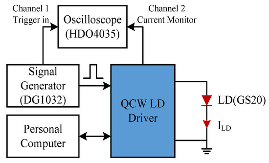 Figure 17 shows the experimental setup used to test the QCW LD driver. The block diagram includes five components: an LD (FOCUSLIGHT GS20) as the driven load; a QCW LD driver, our equipment to be tested; a signal generator DS1032 (RIGOL 30 MHz, 200 MS/s), which provided the pulsed trigger signals; an oscilloscope HDO4035 (Lecroy 350 MHz, 2.5 GS/s) to measure the waveform of the triggered pulses and current pulses; and a personal computer to perform the parameter configuration and status monitoring for the driver.