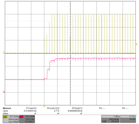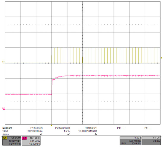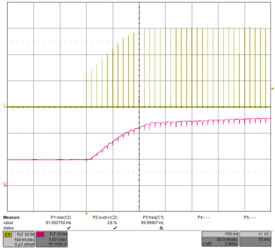 With the same PID parameters, the repetition rate was increased to 100 Hz, and the corresponding sampling time was reduced to 10 ms. The step response is shown in Figure 25. The rising time was 92.0 ms, and the overshoot was 2.6%, which was still well-controlled. However, the number of transition pulses was increased to 10, which was excessive. After we optimized the PID parameters, the rising time of decreased to 48.1 ms, the overshoot increased to 13.4%, and the number of transition pulses decreased to six, as shown in Figure 26. Although the overshoot increased, it accelerated the stabilization time. In practice, the same PID parameters were used for the driver since a few more transition pulses would have little effect on the system.