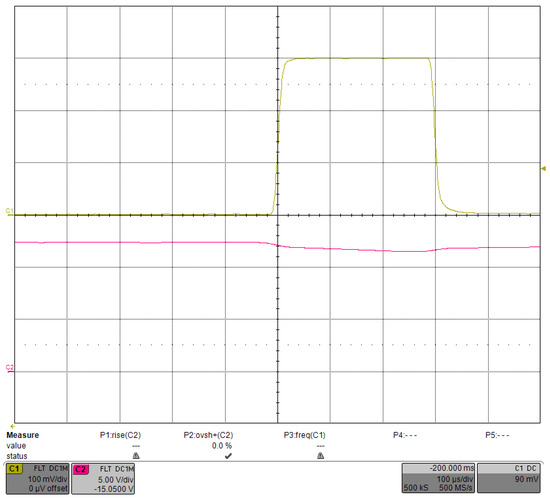 Before performing this test, we set the bias voltage such that the MOSFET would be in the micro-on state during idling, when the base voltage is approximately equal to the threshold voltage . We set the to 0.1 mV, at which point was measured to be 3.7 V. The operating range of was 5–15 V, with a low threshold of 5 V to obtain the correct before the PID started and a high threshold of 15 V to protect the system. The classical Ziegler-Nichols (ZN) method was not fully applicable for tuning the PID parameters in our application, so we used manual tuning in the order of , and . The step response of the driver, shown in Figure 22, had a current of 300 A, a repetition rate of 10 Hz, and a pulse width of 300 s. Channel 1 was the current pulse waveform with three transition pulses. Channel 2 was the waveform with a rising time of 213.9 ms and an overshoot of 2.7%. The glitches on the waveform were due to voltage drops caused by capacitor discharges.