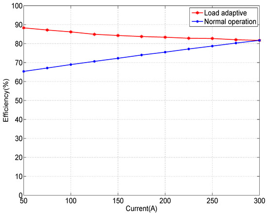 Comparison of the power efficiency in the normal operation mode and the load-adaptive mode.