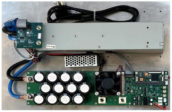 The driver uses a capacitor bank for energy storage, and drops by during discharge, but the current output capacity of the driver is not affected. We calculate the capacity of the capacitor bank using Equations (20) and (21). According to Table 1, and are 300 A and 300 s, respectively. The effect on the power efficiency is reduced by setting to 1 V. The calculated must be at least F, and we use F, preserving a 25% margin: