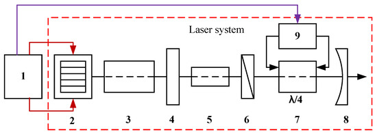 Optical arrangement of the tested QCW laser: (1) QCW LD driver; (2) LD stack GS20; (3) pump coupler; (4) rear mirror; (5) Nd:YAG; (6) polarizer; (7) Pockels cell; (8) output mirror; (9) Pockels cell driver.