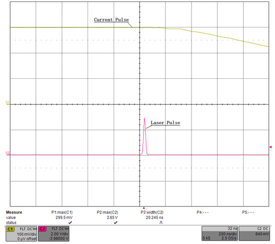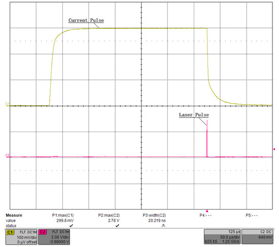 Figure 28 shows a photograph of the developed QCW LD driver, which consists of three components: a commercial SMPS with linearly adjustable voltage, a pulsed constant-current source circuit board with load-adaptive driving, and a low-power AC/DC module to power the board. We verified the functionality of this driver in a home-built laser system with the optical arrangement shown in Figure 29. The QCW LD driver operated with a current of 300 A, a pulse width of 300 s, and a repetition rate of 100 Hz and drove the LD stack GS20 to generate an 808 nm pump light, which was injected into the laser resonator via a pump coupler. The Pockels cell driver used quarter-wave “off-type” voltage to keep the resonator closed, and it switched down to zero at the falling edge of the current pulse. At this point, the Q-factor of the laser resonator dropped instantaneously, and a high-energy 1064 nm laser pulse was immediately emitted. In Figure 30, channel 1 is the waveform of the current pulse, and channel 2 is the optical pulse received by the photodiode. Figure 31 shows a zoomed-in version of Figure 30. The laser pulse width was 20.2 ns, the average power measured by the optical power meter was 3.93 W, and the laser worked well.