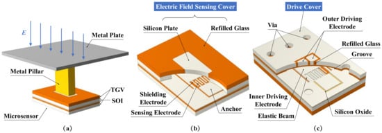 This paper proposed a sensitivity-enhanced vertical-resonant MEMS electric field sensor based on TGV (Through Glass Via) technology [27,28,29,30]. Taking advantage of the fact that TGV technology allows glass and silicon to exist in the same structural layer, the preparation of both an electric field sensing cover and a vertically-driven cover is achieved. The electric field sensing cover based on TGV can significantly reduce the area between the silicon plate and the SOI handle layer, thereby reducing their parasitic capacitance. It can also reduce the distance between the silicon plate and the sensitive structure at the SOI device layer. For the above reasons, the sensitivity of the sensor can be further improved.