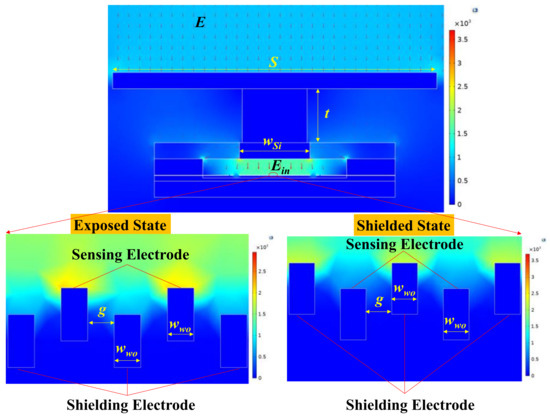 In this section, finite element simulations are conducted to optimize the key parameters that affect the sensitivity of the microsensor. As shown in Figure 3, a finite element structural model is established. A uniform electric field of is applied to the metal plate and the internal electric field is generated in the microcavity, which is imposed on the sensing electrodes and the shielding electrodes (referred to as the working electrodes). The silicon plate is set to floating potential. The working electrodes, SOI handle layer, and silicon in the drive cover are grounded. The displacement of the shielding electrodes is set to 5 μm. By simulating the charge of the sensing electrodes in the exposed state and shielded state under different structural parameters, the charge variation can be calculated.