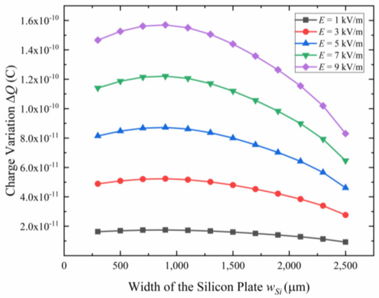 The charge variation ΔQ at the sensing electrodes versus the width of the silicon plate for different electric field intensity .