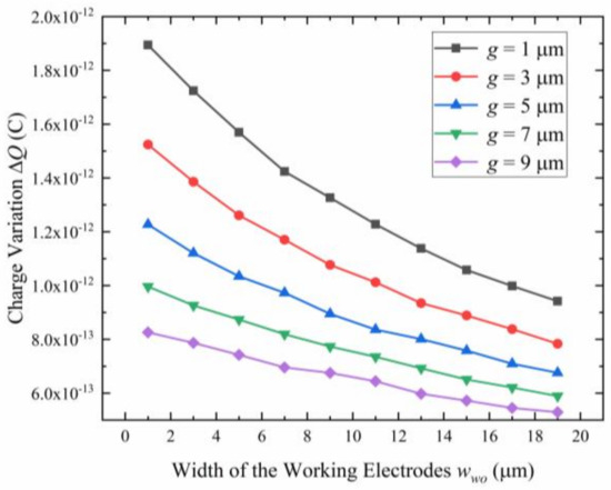 The charge variation ΔQ at the sensing electrodes versus the width of the working electrodes for different gaps between two adjacent working electrodes g.