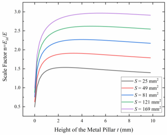 The relationship between the scale factor n and the height of the metal pillar t for different areas of the metal plate S.