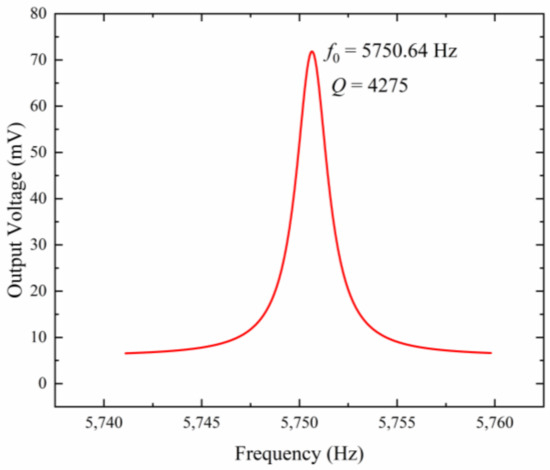 The amplitude–frequency response of the microsensor is shown in Figure 11. The resonant frequency of the microsensor is 5750.64 Hz, which is in accordance with the simulation result of 5681.4 Hz. The discrepancy is mainly caused by the fabrication process error and the simulation deviation. The function of the amplitude–frequency response curve after Lorentz fitting can be expressed as:
