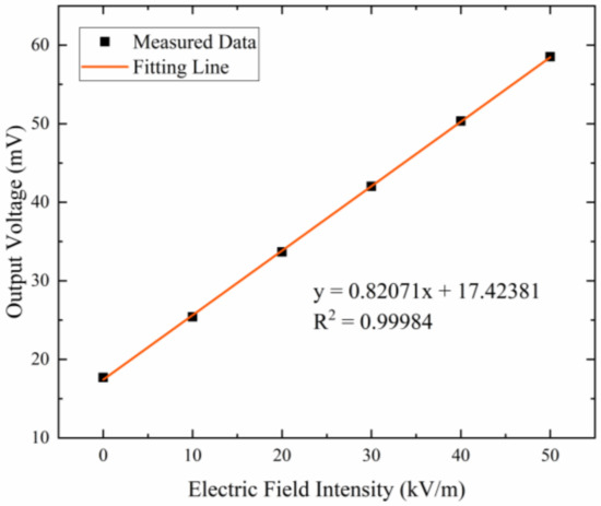 Figure 12 shows the response of the microsensor to the applied electric field intensity when the microsensor works in the resonant mode. The microsensor is tested in the electric field ranging from 0–50 kV/m and the experimental result shows that the sensitivity of the microsensor is 0.82 mV/(kV/m). The linearity of the microsensor is calculated to be 0.65%. In addition, experimental results show that a driving voltage of 7 V DC and 0.07 V AC is required for the microsensor, which is beneficial to the reduction of power consumption.