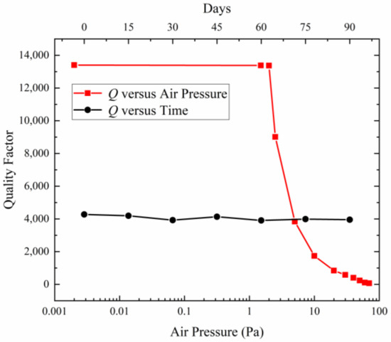 As shown in Figure 13, the quality factor of the microsensor is tested every 15 days. It can be seen that the quality factor remained basically around 4000 during the 90-day testing time, which indicates the airtightness of the microsensor is good.