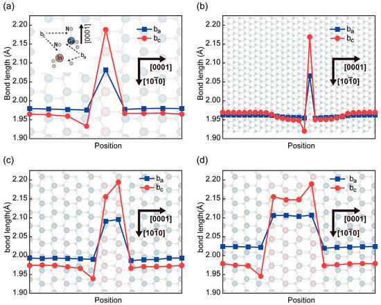 The atomic bonds in the InN/GaN SL were simulated, and the outcomes were compared with bonds within the bulk InN and GaN. Ⅲ-N with wurtzite structure have two types of first neighbor atomic bond length: Ⅲ-N in the basal plane and Ⅲ-N along the c-axis, and these atomic bonds were denoted as ba and bc. The bc and ba of bulk compounds were calculated in advance and served as references. The values of these bonds were 1.974 Å and 1.969 Å for GaN, and 2.143 Å and 2.144 Å for InN, respectively (the difference compared with literature is less than 1%) [25]. The wurtzite GaN and InN have an anisotropic crystal structure and a nonzero spontaneous polarization along the c-axis due to the inversion symmetry center being broken and deviation from an ideal tetrahedral coordination [26]. Besides, the symmetry would be reduced due to the strain. The bond length distributions of InN1/GaN7 and InN1/GaN27 were first calculated to investigate the strains in the SL with single molecular layer InN. The length of ba in the InN1/GaN7 has decreased by 3% in the InN layer, and it has increased by 0.4% in the GaN layers on average (Figure 1a). Meanwhile, the length of bc has increased by 2% in the InN layer, and it has decreased by 0.5% in the GaN layers on average. This means that the InN single molecular layer was subjected to a higher in-plane compressive strain level than GaN layers, and this in-plane strain was released through the out-plane bonds by the expansion and contraction. Meanwhile, the strain in the molecular layer exacerbated the deviation of InN/GaN SLs from the ideal tetrahedral coordination and introduced piezoelectric polarization along the opposite direction in InN and GaN layers. In addition, the strain exerted by GaN layers on the InN single molecular layer should have a limit, and this limit was manifested in the SL with thick GaN layers. Therefore, the distribution of bond length in InN1/GaN27 is further illustrated in Figure 1b. The bond lengths of the GaN layer were different from that of the bulk GaN within a range of six to seven MLs on both two sides of the InN layer. The GaN layers beyond this range maintained the same bond lengths as the bulk GaN, and these layers were unable to provide strain to the InN single molecular layer. Although InN/GaN SLs with single-layer InN had been grown in different ways [11,12], the process of controlling single-layer growth of InN remains a challenge [27]. Therefore, this work also studied the internal strain of SL with multi-layer InN. The period of the SL was fixed to 12 MLs, and the thickness of InN well layers in the SL was gradually increased from one layer to four MLs. The bond lengths of InN1/GaN11 and InN4/GaN8 were taken for comparison, and that of InN2/GaN10 and InN3/GaN9 are shown in Figure S1. When the thickness of the InN well increased from one layer to four MLs, the lengths of ba in each layer of InN or GaN became uniform, and the in-plane strain of GaN layers increased. Meanwhile, the changes of bc were primarily concentrated at the interfaces, and other molecular layers maintained the same bc as the bulk compounds. These indicated that the strains in the well and barrier layers were predominantly in-plane strains for the SL with multi-layer InN. These in-plane strains tend to accumulate within the SL and are difficult to release, thus increasing the probability of introducing dislocations during crystal growth. The changes of bc at the interfaces of all structures could be explained by the charge transfer during the bonding of interfaces.