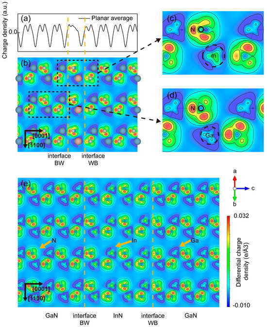 Differential charge density of InN1/GaN7 and InN4/GaN8. (a) The normalized planar average differential charge density of InN1/GaN7 along the c-axis. (b) The contour plot of the differential charge densities in a () slice of InN1/GaN7. The two interfaces between the InN and the GaN layers were represented as interface BW and interface WB. (c,d) The enlarged differential charge density contour plot near the In atom and Ga atom, respectively, and the black dashed circle represented the ionic radius. (e) The contour plot of the differential charge densities in a () slice of InN4/GaN8, and the InN and GaN areas were divided by the yellow dashed lines. The compass and the axis labels were used to calibrate the orientation of the lattice. The different colors were used to represent the positive and negative values of differential charge densities.