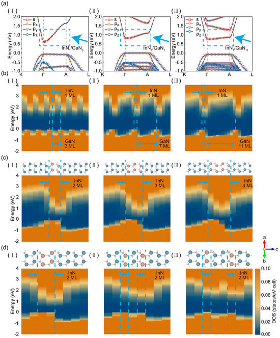 Projected density of states and band structure with different InN and GaN thickness and structures. (a) Band structures between K- and L-points of InN1/GaN3, InN1/GaN7, and InN1/GaN11, respectively. The blue dashed box highlighted the transition of the conduction band. (b) The projected densities of states of InN1/GaN3, InN1/GaN7, and InN1/GaN11. These densities of states were extended 6, 3, and 2 times along the c-axis, respectively. The blue dotted lines demarcate the InN and GaN layers in 1 period. (c) The projected density of states and crystal structure of the SL with different thicknesses of InN layer. The period was fixed as 12 MLs. (d) The band structures of the SL with different intervals of InN bilayer in the real space. The period of SL was fixed as 8 MLs. (I), (II), and (III) were InN bilayers with GaN intervals of 0, 1, and 2 MLs, respectively.