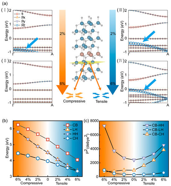 The electron structure under different external forces. (a) The band structures between Γ- and A-points under different external forces (2% and 6% compressive strains were represented in (I) and (II), 2% and 6% tensile strains were represented in (III) and (IV)). The blue arrow highlighted the position of the CH band and the model illustrated the form of applied strain. The contribution of different orbitals was illustrated by the size of different symbols as shown in (I). (b,c) Energies of different bands at Γ-point and the transition possibility between these bands.