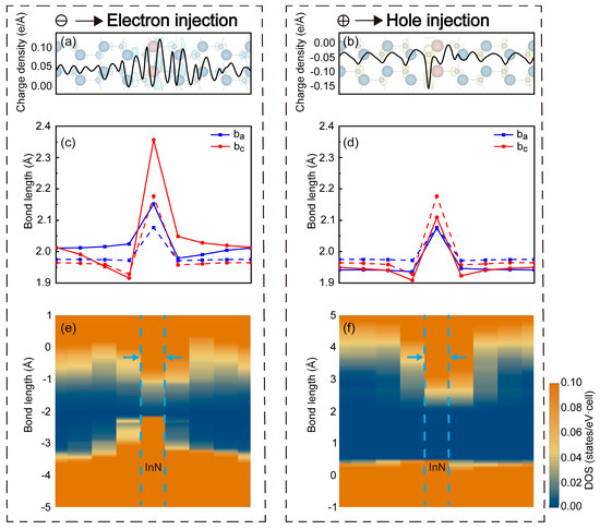 The influence of charge injection. (a,b) Distributions of injected electrons and holes along the c-axis; the blue and yellow surfaces illustrated the accumulations of these charges. (c,d) The bond length distributions. The solid lines corresponded to the SL with charge injection, and the dashed lines corresponded to the steady-state SL. (e,f) The projected density of state with charge injection. The InN layer was marked with blue dashed lines.