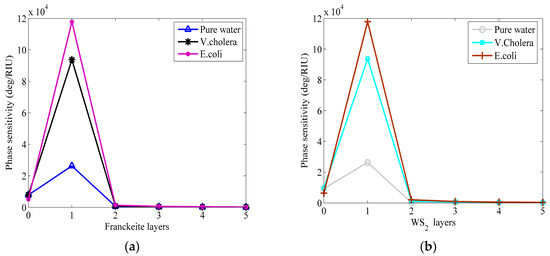 Moreover, Figure 4 illustrates the relationship between phase sensitivity and the number of Franckeite layers in the WS2 monolayer, as well as the number of layers in the Franckeite monolayer. One can visualize from the figure that both the Franckeite and WS2 layers are monolayers, and the sensor can obtain the best phase sensitivity value for the detection of waterborne bacteria at the optimum thickness of Ag and TiO2.