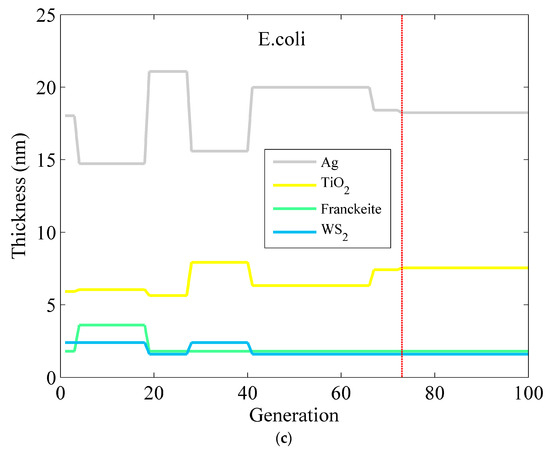 The optimized thickness of the Ag–TiO2–Franckeite–WS2 structure via the SOA for detection in (a) pure water, (b) V. cholera, and (c) E. coli.