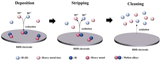 The electrolyte containing Bi (II) and target heavy metal ions were injected into the thin-layer cell through the multi-channel syringe pump. The ASV test was conducted, and the electrochemical process is shown in Figure 3. The heavy metal ions were first electrodeposited on the surface of the BDD electrode under a certain voltage by reduction. Bi ions can form molten alloys with target heavy metal ions, enhancing the current response [30]. During the deposition process, the sample flowed through the thin-layer cell and the electrode surface at a constant flow rate. Then, the heavy metal ions were dissolved within the proper potential window. During the stripping process, the sample remained stationary. Prior to the next test, the cleaning step was carried out to eliminate residual heavy metal ions from the working electrode by applying a high voltage.