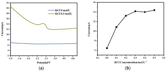 In this study, acetic acid–sodium acetate buffer (0.1 mol/L, pH = 4.5) was used as the supporting electrolyte solution. The effect of the addition of KCl in the buffer on the stripping peak current of Zn2+ (200 µg/L) was investigated. As shown in Figure 4a, the addition of KCl to the buffer solution resulted in a significant enhancement of the stripping peak signal compared to the KCl-free buffer solution. In the absence of KCl, the diffusion resistance of the thin-layer cell is large, resulting in a great ohmic drop. This reduces the driving force for electron transfer at the electrode surface [31], making it difficult to achieve the desired current response. The addition of KCl to the buffer solution increases the conductivity of the electrolyte solution, reducing the ohmic drop and improving detection performance. It has been reported [32] that Zn2+ forms weak complexes with acetate and chloride ions, which facilitates the reduction and increases the stripping peak signal. Consequently, KCl was incorporated into the acetic acid buffer solution as the supporting electrolyte solution in subsequent experiments.