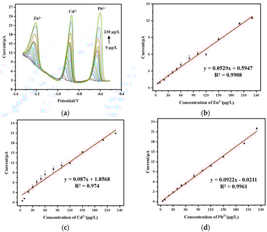 Simultaneous detection of Zn2+, Cd2+, and Pb2+: (a) stripping voltammetry curves; (b) calibration curve for Zn2+; (c) calibration curve for Cd2+; (d) calibration curve for Pb2+.