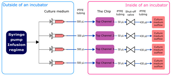 Non-microgravity control tests were run using a custom-made jig (Figure 2). Culture medium was infused in the system at a flow rate 1 µL/min (generating 0.0004 dyn/cm2 shear stress) using a syringe pump (ISPLab02, Baoding Shenchen Precision Pump Co. Ltd., Baoding, China) and cultivated for 7 subsequent days. Inflow and outflow connections from top channels of the chip were ensured with polytetrafluoroethylene (PTFE) tubing (800 µm inner diameter (i.d.)) (Darwin microfluidics, Paris, France) and 1.5 cm pieces of Pharmed® BPT rubber tubing (800 µm i.d.) (Saint-Gobain, Courbevoie, France) for connection to mini-Luer connectors (microfluidic ChipShop, Jena, Germany). Integrated shut-off valves (Darwin microfluidics, Paris, France) were integrated in between the inlet tubing path to avoid microbubble generation in the chip channels during exchange of the culture medium. The outflow was collected in 15 mL conical tubes (Sarstedt, Nümbrecht, Germany). All components were organized and fixed in place using laser-cut poly(methyl methacrylate) (PMMA) plates.