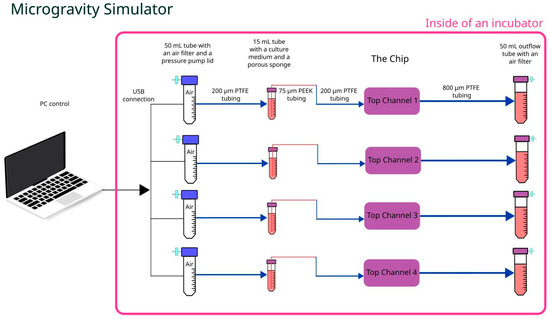 Microgravity tests were run using a simulated microgravity machine combined with Cellbox Labs proprietary pumping solution to substitute syringe pumps and ensure culture medium infusion in the top channels of the chip at a flow of 1 µL/min (see Figure 3). Similarly to previously, 800 µm i.d. PTFE tubing in combination with rubber tubing and Luer male plugs were used to connect the chip’s top channels with either the pressure-driven culture medium pumping solution or with 50 mL conical tubes (Sarstedt, Germany) for outflow collection. Due to constant rotation, an additional 15 mL tube (Sarstedt, Germany) with a rigid capillary tubing retaining porous sponge at the bottom of the tube was installed in the inflow line, ensuring constant supply of the culture medium regardless of its position. Simultaneously, the same capillary tubing (20 cm long PEEKsil with a 75 µm i.d.) (IDEX Health & Science, Oak Harbor, WA, USA) reduced culture medium flow down to a rate similar to that used in normogravity experiments. The whole setup including chip, pressure pumps, and collection tubes was attached to the inner frame using holders or adhesive tape, then clinostat frames were balanced out to ensure uninterrupted and smooth rotation.