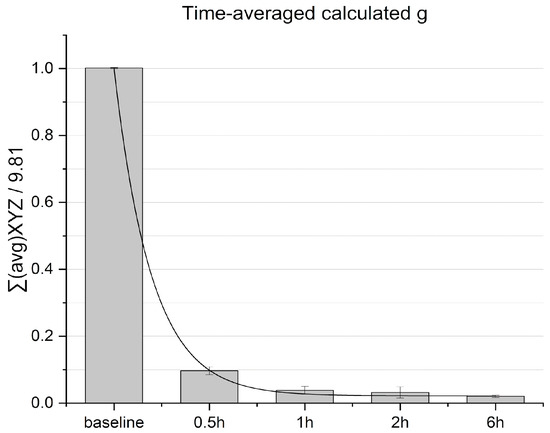 Prior to conducting the microgravity experiments, validation of the microgravity simulation system was performed by recording acceleration values and calculating the time-averaged g. Time-averaged acceleration decayed within an hour and continued to decrease to reach 0.02 g ± 0.003 values within 6 h, indicating averaged nullification of the gravity vector over time (see Figure 4).