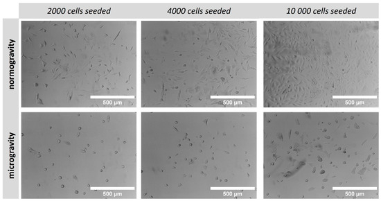 In order to compare cell growth under normal gravity and microgravity conditions, A549 cells were seeded on a 24-well plate in various densities and cultivated for 7 consecutive days. Cell morphology was observed under brightfield microscopy and differences between normogravity/microgravity conditions are compared in Figure 5. An obvious reduction in cell growth was observed during microgravity regardless of the initial seeding density when comparing with cells grown under normal gravity. Simultaneously, cell morphology was also altered when cultivated under microgravity conditions, leading to more round-shaped cells (Figure 5).