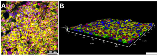 Immunofluorescence images of A549 cells on chip at normal gravity: (A) maximum projection of A549 cell layer (Z-stack); (B) 3D reconstruction of the A549 cell layer. Blue—nuclei (DAPI); yellow—F-actin; green—EpCAM; red—CD133. Scale bar: 50 μm.