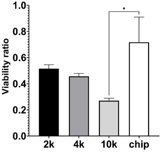 Effect of microgravity on A549 cell viability, performing CCK8 metabolic activity measurement. “2 k”, “4 k”, and “10 k” denotes cells cultivated on a 24-well plate with initial seeding density 2000, 4000, and 10,000 cells per well, respectively; “chip” corresponds to cells grown in OOC setup using continuous flow. Viability ratio is calculated by comparing CCK8 metabolic activity measurements under microgravity versus normal gravity. Significant difference is marked with asterisk (* p = 0.0112).