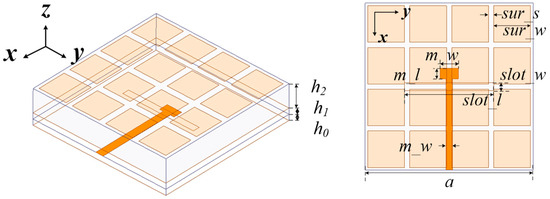 Recently, metasurface (MS) antennas [17,18,19] with wide-band and low-profile performances have received more and more attention. In this work, a 4 × 4 square patch metasurface antenna fed by striplines was designed. The structure of the metasurface antenna fed by striplines is exhibited in Figure 1. It was composed of three substrate layers and four metal layers. The three substrates of the metasurface antenna were all Rogers Duroid 4003, with a relative dielectric constant of 3.55 and a loss tangent of 0.0027. The thickness of the upper substrate was h2, with a value of 0.762 mm. The thickness of the middle substrate was h1, with a value of 0.254 mm. Additionally, h0 was the thickness of the bottom substrate, whose value was the same as that of the middle substrate. Different from most of the conventional microstrip feeding metasurface antennas, the stripline was adopted as the feeding line. There are two reasons for using striplines. The first is that the microstrip line is a semi-open transmission line structure that propagates the primary mode, which is a quasi-TEM wave. However, as a fully enclosed transmission line, the stripline transmits TEM mode electromagnetic waves, and its upper and lower sides have a ground layer. This brings great advantages, such as good signal shielding and small transmission loss. In addition, because of the semi-open structure of the microstrip line, it can generally only be placed on the top or bottom layer of the antenna, and the signal can only be connected in a single direction. As a result, the electromagnetic wave can only be radiated and transmitted in one single direction, which limits the degree of design freedom. However, due to the existence of two ground layers, the circuit based on the stripline can be expanded in both the upper and lower dimensions, so there is greater design freedom than the microstrip.