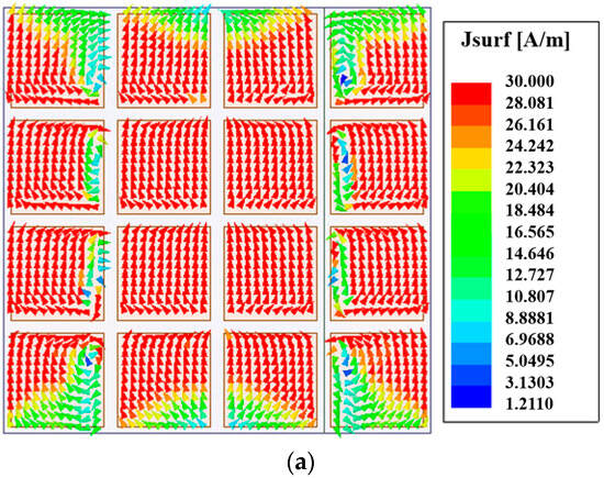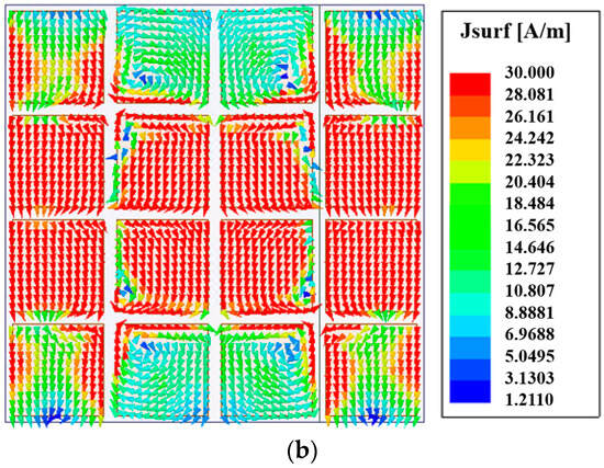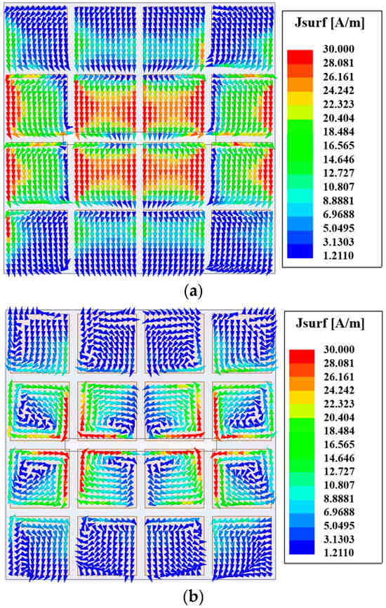 Surface current distribution of the metasurface at two frequency points: (a) 23.5 GHz and (b) 30.1 GHz.