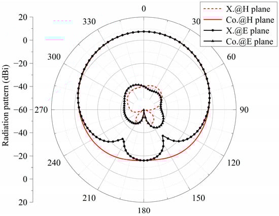 The simulated S parameters and gain curves are shown in Figure 5 under the radiation boundary condition. The |S11| in Figure 5 was calculated using the formulas in [20]. As seen, the |S11| is lower than −10 dB within the frequency range of 22.2 to 31.8 GHz. The impedance bandwidth of −10 dB was 35.6%. In the range of 22.2–31.8 GHz, the value of the gain was basically stable at 7.5 dBi, which increased the gain by 0.5 dBi compared with the single-polarized metasurface antenna in Section 2.1.1. Figure 6 shows the radiation patterns of the E- and H-planes of the metasurface antenna at the central frequency of 27 GHz. Compared with the single-polarized metasurface antenna proposed in the previous section, the radiation patterns of the E- and H-planes of the antenna are symmetrical. With the introduction of a pair of differential feed striplines, the antenna was symmetrical on the E-plane, and the cross-polarization level of the E-plane was greatly improved. In addition, the front-to-back ratio of the antenna radiation pattern was also improved to 23.5 dB, which is 8 dB higher than the front-to-back ratio of 15.5 dB in the previous section. Figure 7 is the surface current distribution diagram of the square patch layer of the differential double-slot coupled feed metasurface antenna at the two resonant frequency points of 23.5 GHz and 30.1 GHz. It can be seen from the diagram that compared with the single-slot coupled feed metasurface antenna, the metasurface antenna coupled to the differential double-slot can not only excite the middle two rows of square patches but also effectively excite the upper and lower rows of patches. The surface current of the entire 4 × 4 square patch antenna was more uniform, and the current intensity was stronger, which helped to improve the antenna gain, further supporting the conclusion that the antenna gain was increased by 0.5 dBi as shown in Figure 6.