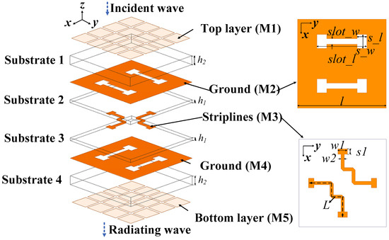 As shown in Figure 8, the TA element works as follows. It is assumed that the electromagnetic wave propagates in the positive direction of the z-axis to the negative direction of the z-axis. When the incident wave along the x-axis direction of the polarization direction of the electric field is incident on the upper receiver plane (M1) of the TA element, two coupling gaps in the upper ground layer (M2) couple the energy to the striplines of the phase delay line layer (M3). Because the stripline is bent by 90°, the transmission direction of the electromagnetic wave also rotates by 90°. When the electromagnetic wave is transmitted to the other end of the striplines, the polarization direction of the electric field is reversed by 90° and becomes along the y-axis direction. At this time, it matches the coupling gap along the x-axis in the lower ground plane (M4) and radiates the electromagnetic wave through the lower transmitter plane (M5).